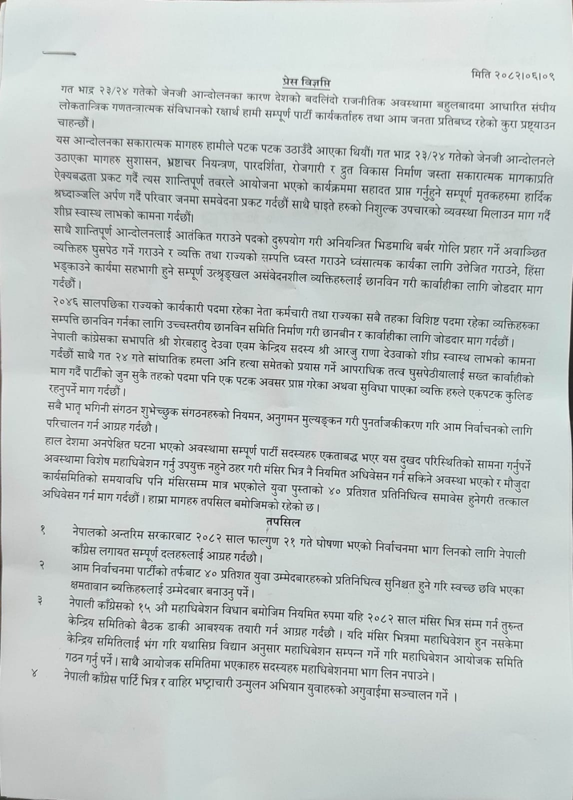 त्यस्तै, कांग्रेस भित्र र बाहिर भ्रष्टाचार उन्मुलन अभियान युवाहरुको अगुवाइमा सञ्चालन गर्न, जेन–जी आन्दोलनको क्रममा भएको भौतिक क्षतिमा निःशुल्क रुपमा इन्जिनियरिङका काम सुरु गर्न र सहयोग गर्नसमेत भनिएको छ ।