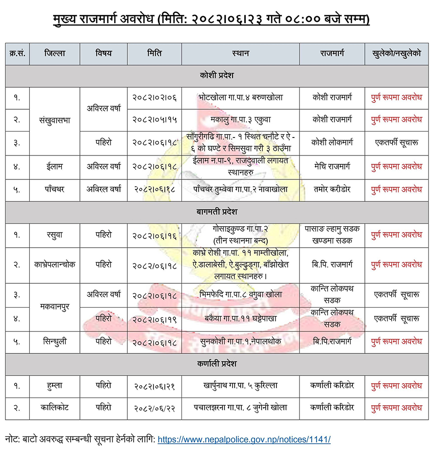 हेर्नुहोस् अवरोध भएका राजमार्ग र सडकको विवरण :