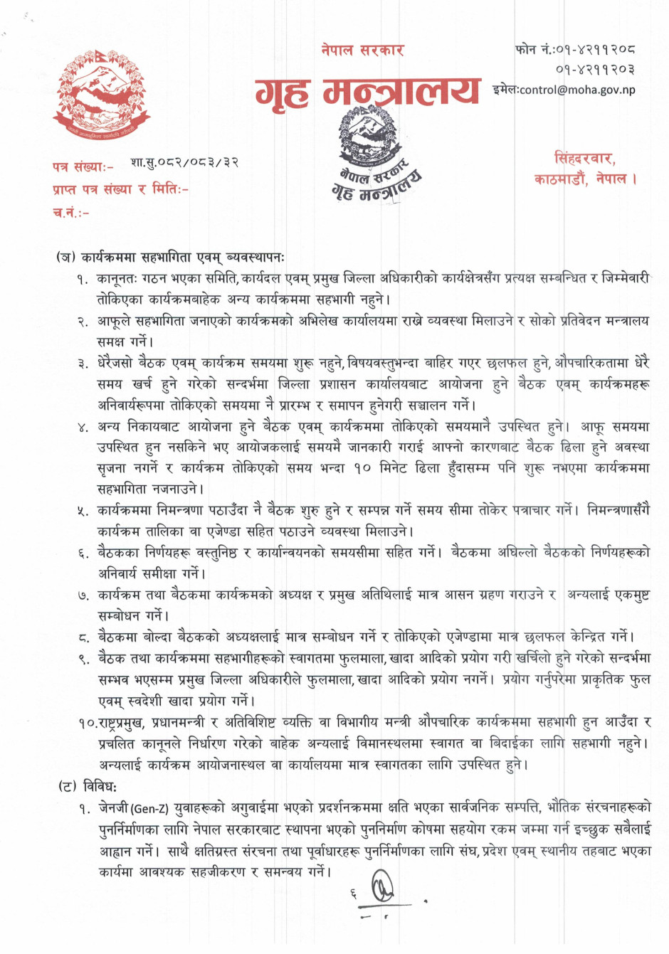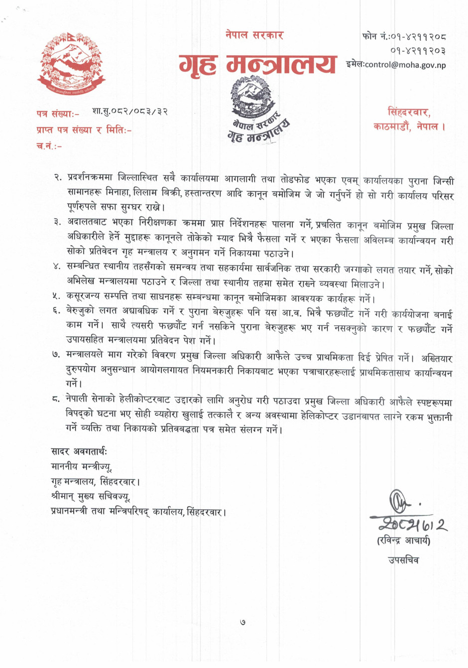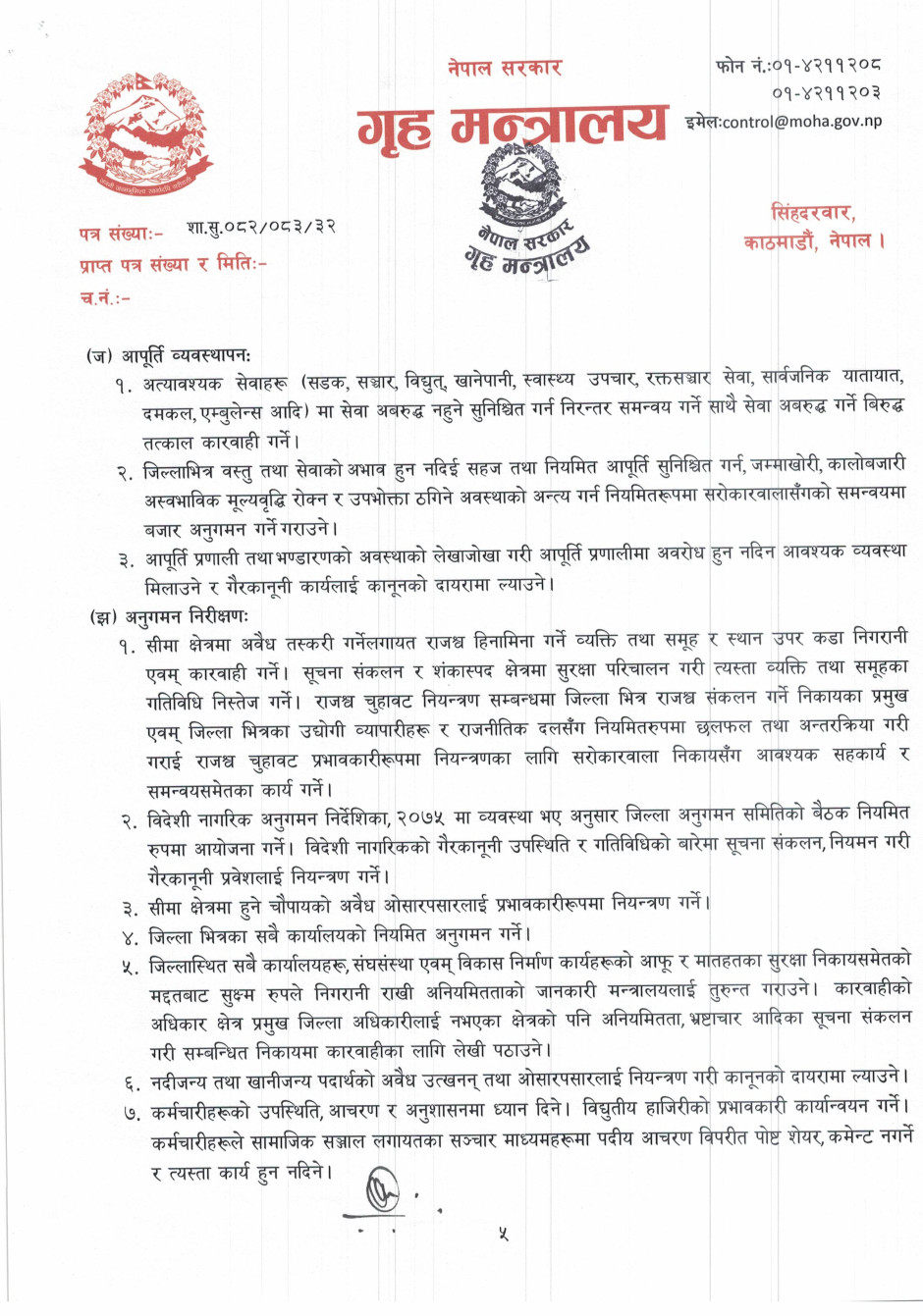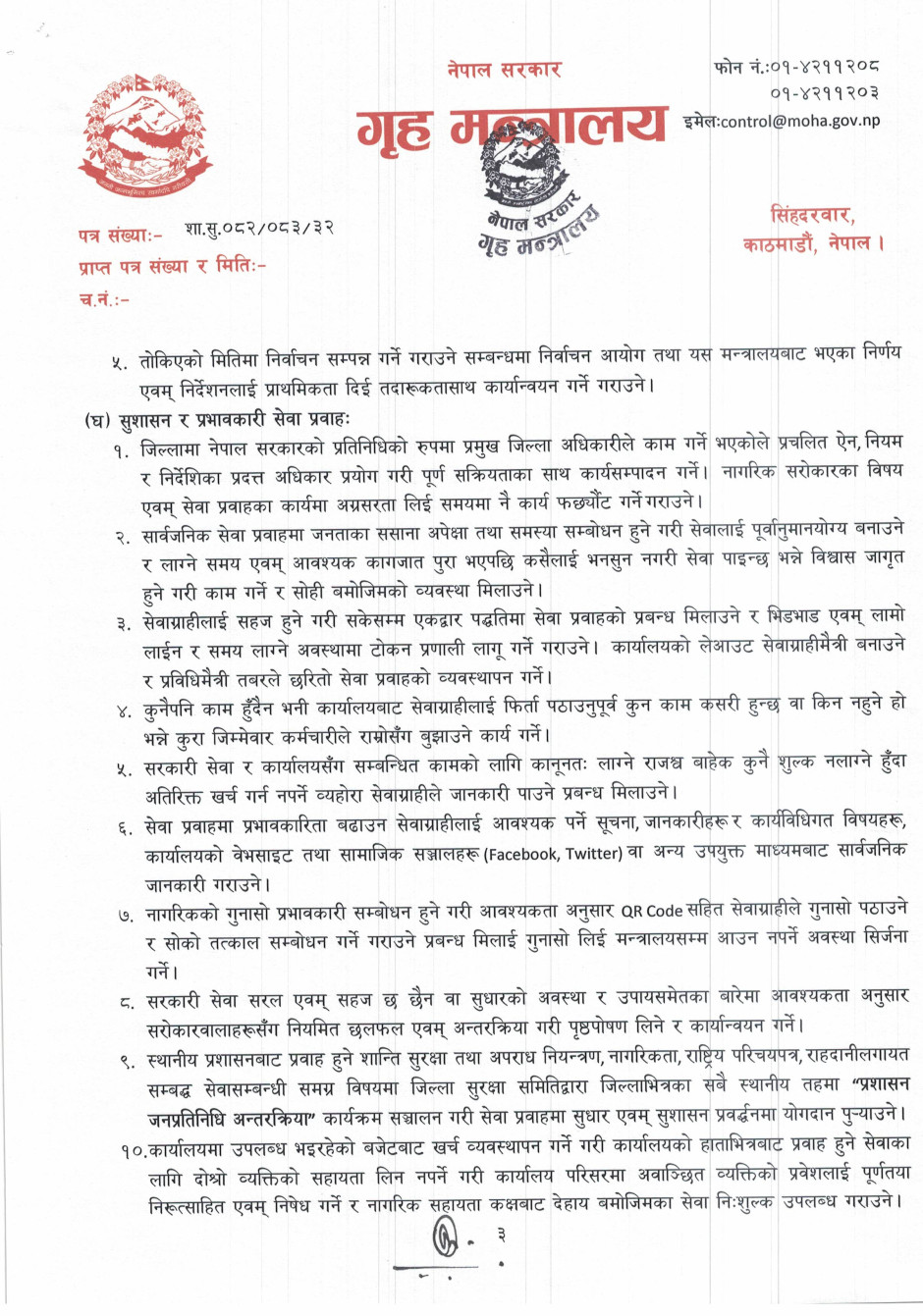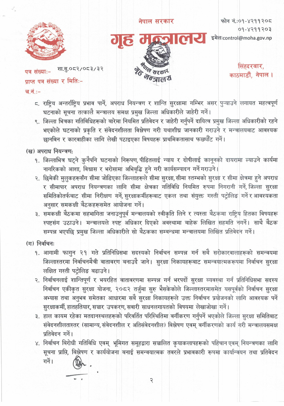 कात्तिक २ काठमाडौं । गृह मन्त्रालयले देशभरका सबै जिल्ला प्रशासन कार्यालय ९सीडीओ० कार्यालयहरुमा विभिन्न निर्देशन दिएको छ ।