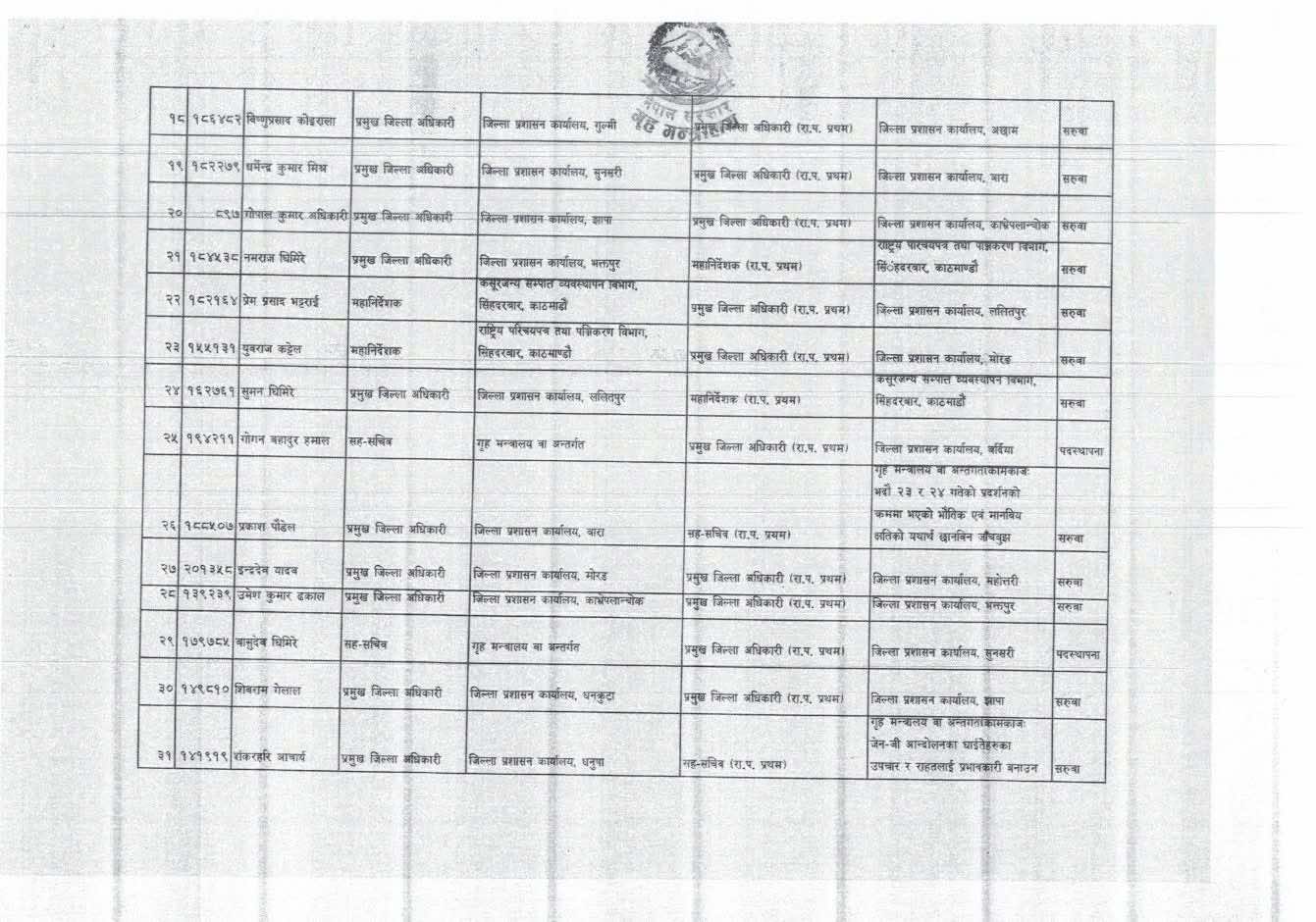 गृह मन्त्रालयले आफ्ना मातहतका दुई विभागका महानिर्देशक सहित ललितपुर, मोरङ, रुपन्देही लगायतका जिल्लाका प्रमुख जिल्ला अधिकारी सरुवा गरेको हो ।
