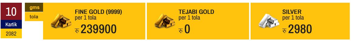 काठमाडौं,१० कात्तिक । नेपाली बजारमा आज पहेलो धातु सुनको भाउ घटेको छ । आइतबारको तुलनामा सुनको मुल्य आज २ हजार रुपैयाँले घटेको हो ।