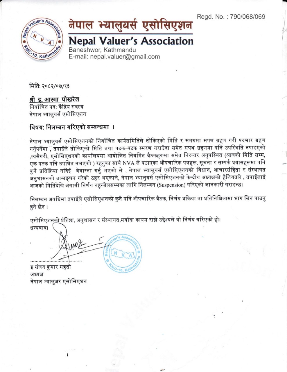 निलम्बन भएसँगै इ.पोखरेलले अवधिभर एशोसिएसनको कुनै पनि औपचारिक बैठक, निर्णय प्रक्रिया वा प्रतिनिधित्वमा भाग लिन पाउने छैनन् । इ.पोखरेललाई कार्यसमितिको नियमित बैठक र सपथ ग्रहणका लागि पटक–पटक जानकारी गराउँदा पनि नआउने, अन्य कुनै पनि बैठकमा उपस्थित नहुने, प्रतिक्रिया पनि नदिने, बेवास्ता गर्ने जस्ता कार्यले निलम्बन गर्न बाध्य भएको अध्यक्ष महतोले बताए ।