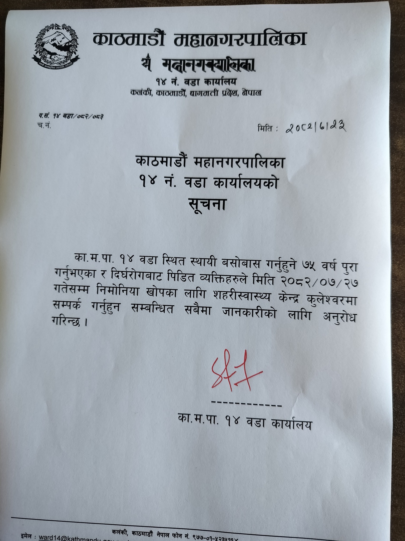 आफ्नो वडाभित्र बसोबास गर्ने ७५ वर्ष पुरा भएका र दिर्घरोगबाट पीडित व्यक्तिहरुलाई कात्तिक २७ गतेभित्र शहरी स्वास्थ्य केन्द्र कुलेश्वरमा सम्पर्क गर्न वडाध्यक्ष सुमन श्रेष्ठले आग्रह गरेका हुन् ।