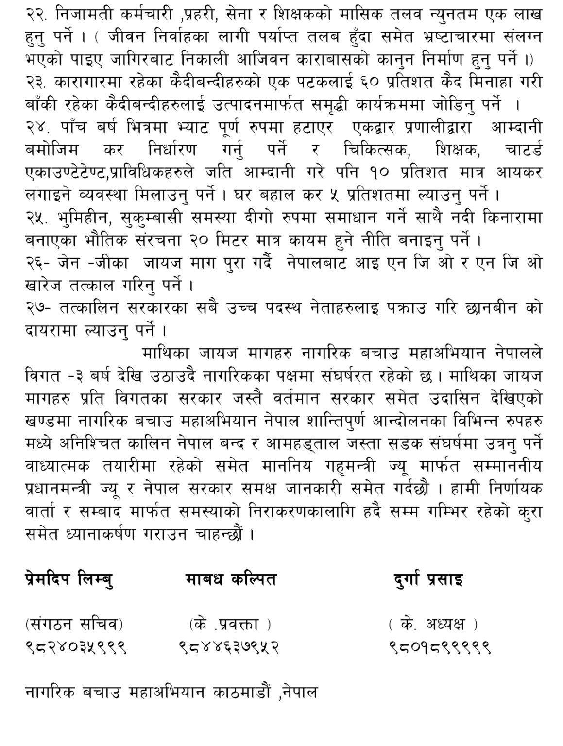 दुर्गा प्रसाईं नेतृत्वको ‘राष्ट्र, राष्ट्रियता, धर्म, संस्कृति र नागरिक बचाऔं महाअभियान’ले गृह मन्त्रालयमा २७ बुँदे माग पत्र बुझाएको छ ।
