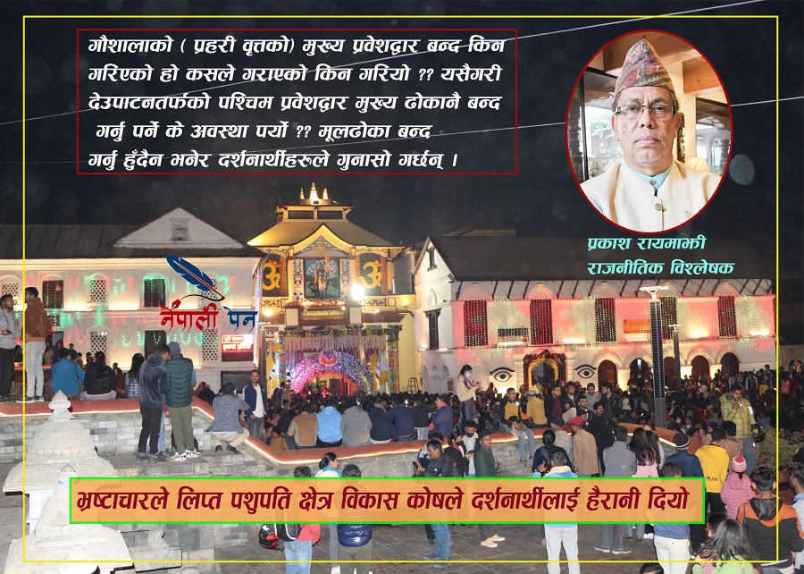 प्रकाश रायमाझी । पशुपति क्षेत्र विकास कोषले आराध्यदेव भगवान पशुपतिनाथको दर्शनार्थीहरूलाई साह्रै दुःख दिएको छ। मन्दिरभित्र जथाभावी फलामका रेलिङहरू (बेरीकेट) राखेर प्राचीन सम्पदास्थलको मौलिक स्वरूप नै बिगारेको छ। खाली पैसा मात्रै उठाउने उद्देश्यले व्यापारिक मनस्थितिगर्दा हाम्रो आस्थामाथि गहिरो चोट पुगिरहेको छ।