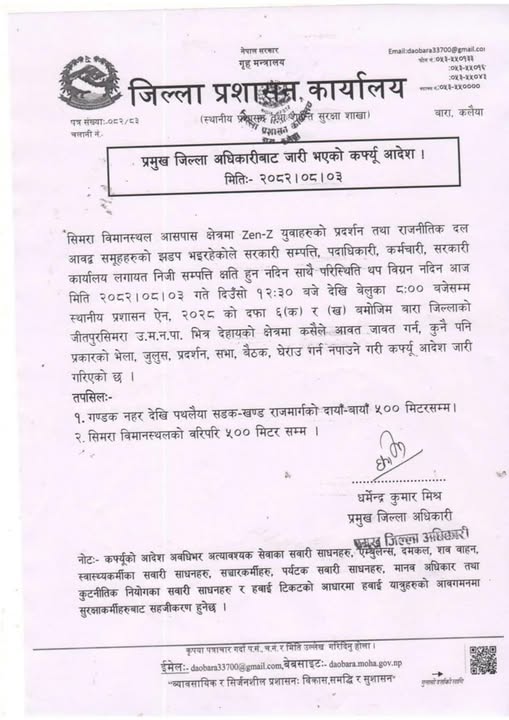 बारा, ३ मंसिर । एमाले नेता महेश बस्नेत आउने भएपछि बाराको सिमरामा प्रहरी र जेनजी युवाबीच झडप भएको छ । थप क्षति हुन नदिन जिल्ला प्रशासन कार्यालय बाराले सिमरामा कर्फ्यू आदेश जारी गरेको हो ।
