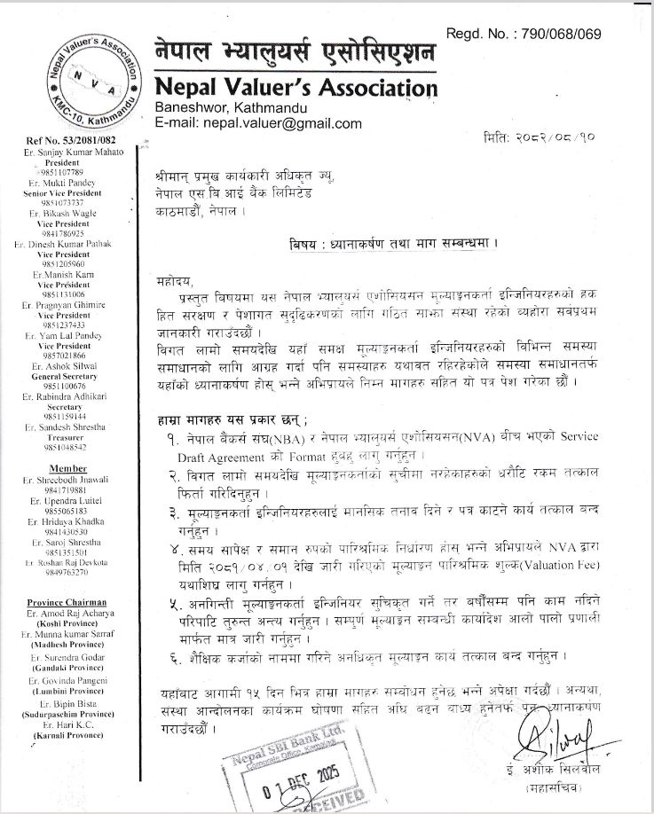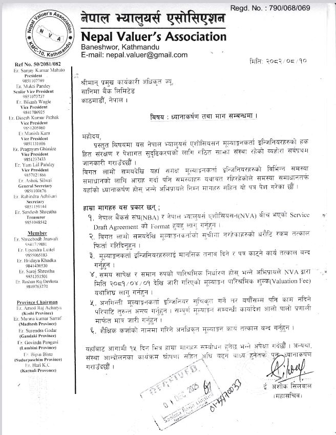 एनभिएले मुल्यांकनकर्ता इन्जिनियरहरुको समस्या १५ दिन भित्र नसुल्झाए आन्दोलनका कार्यक्रम घोषणा गर्ने चेतावनीसहित ध्यानाकर्षण पत्र नेपाल एसबिआई बैंक, सानिमा बैंक, एन.आइ.सि एशिया बैंक, प्रभु बैंक र प्राइम कर्मसियल बैंकलाई बुझाएको हो ।