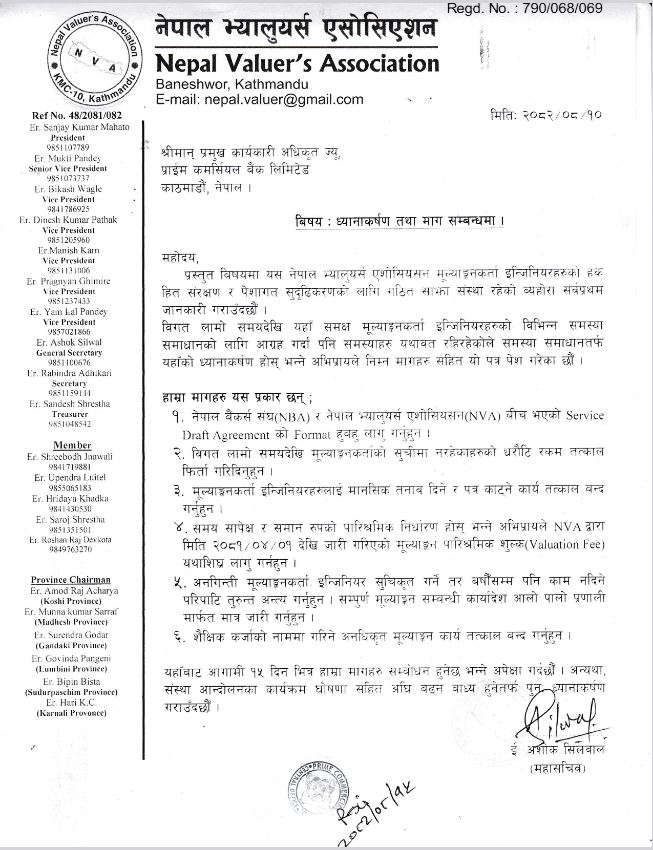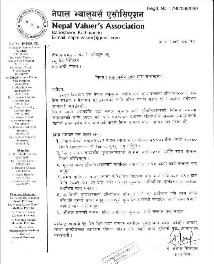 एनभिएका महासचिव इ.अशोक सिलवालको हस्ताक्षरसहितको जारी ध्यानकर्षण पत्रमा नेपाल बैंकर्स संघ र एनभिएबीच भएको सर्भिस ड्राफ्टको फर्र्माट हुबहु लागु गर्न माग गरिएको छ ।