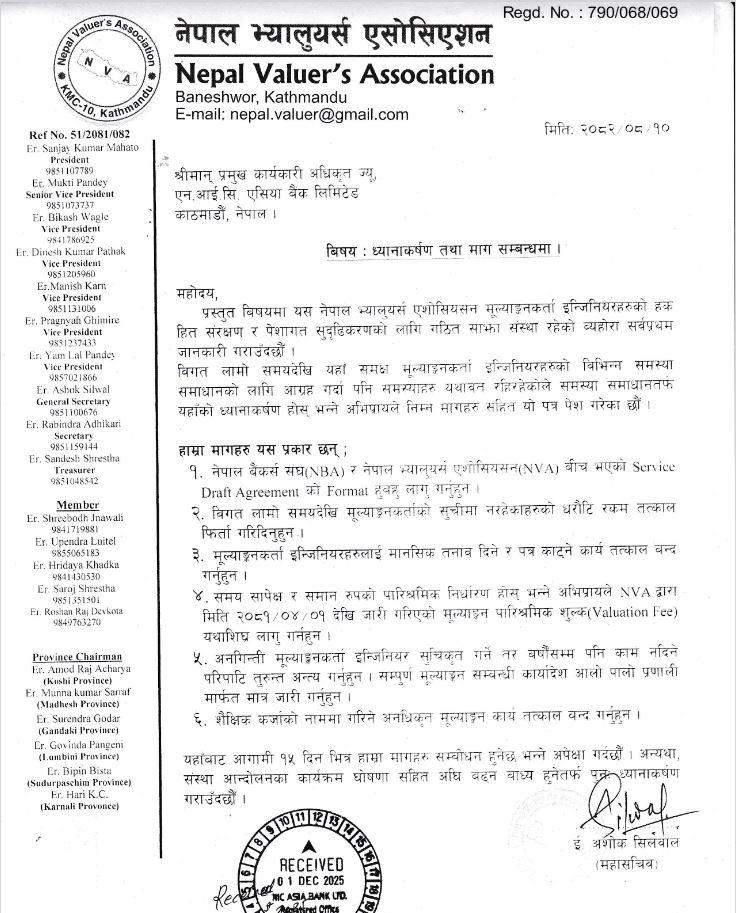 काठमाडौं, १५ मंसिर । सम्पक्ति मुल्यांकनकर्ता इन्जिनियरहरुको हकहित संरक्षण र पेशागत सुदृढिकरणको लागि स्थापित नेपाल भ्यालुयर्स एशोसिएशन (एनभिए)ले विभिन्न ५ वटा बैंकहरुलाई १५ दिने अल्टिमेटम दिएको छ ।