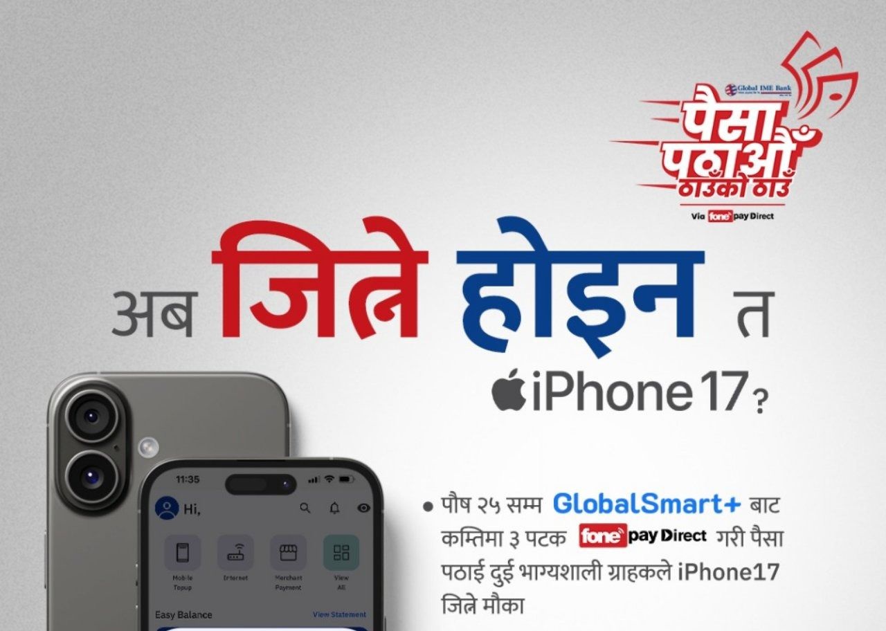 ग्लोबल आइएमई बैंक लिमिटेडले बैंकको मोबाइल बैंकिङ्ग–ग्लोबल स्मार्ट प्लसबाट कम्तिमा ३ पटक फोनपे नेटवर्कमार्फत रकमान्तर गर्दा आइफोन १७ जित्ने योजना सार्वजनिक गरेको छ ।