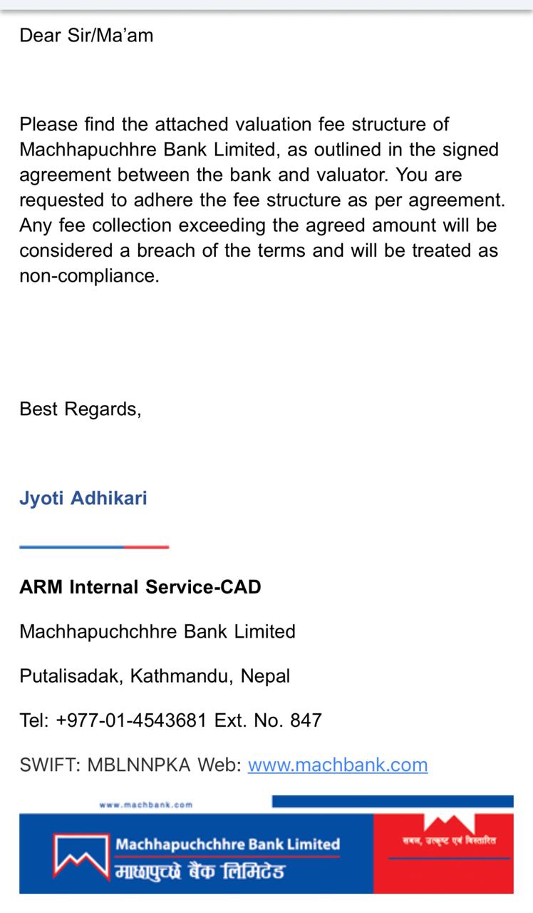 एनभिएले २०८१ साउनदेखि लागु गरेको सम्पत्ति मुल्यांकन फि बैंकसँगको आन्तरिक सहमतिमा मुल्यांकनकर्ताहरुले लिदै आइरहेका थिए । बैंकसँग भएका सहमतिलाई लत्याएर बैंकले बुधबार (आज) सो फि लिएमा भ्यालुएटरलाई कारबाही गर्छौ भन्ने धम्कीपुर्ण मेल पठाएको छ । यसरी नै पेल्दै जाने हो भने एनभिएले बैंकविरुद्ध कडा आन्दोलन गर्न बाध्य हुने पनि सचिव इ.रविन्द्र अधिकारीले चेतावनी दिए ।