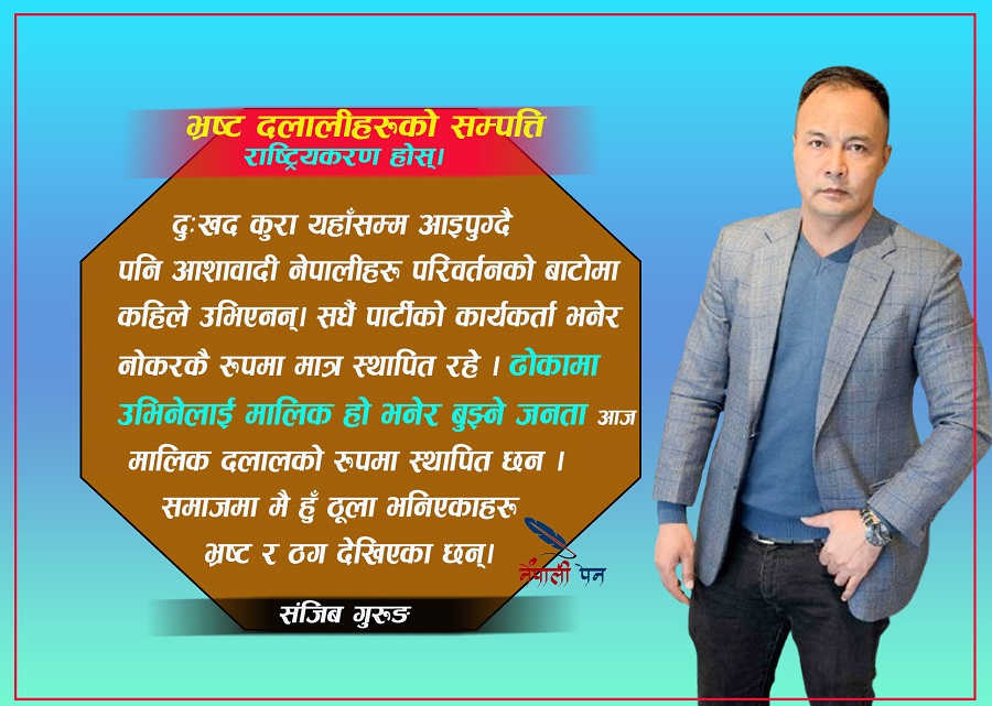 संजिब गुरुङ्ग । ३ करोड जनसङ्ख्या नभएको देशमा १७८ राजनीतिक पार्टी आफ्नो एजेन्डा बोकेर जनतासामु कुद्दै गर्दा आज काठमाडौँमा देखिएको बत्ती धरानमा देखिएको माटोले देश र जनताको भविष्य कस्तो कोर्ला हेर्न बाँकी छ १ २००७ सालपछि उदाएका दलहरूले गरेको देशप्रति र जनताप्रति देखाएका प्रतिबद्धताहरु आज ८२ सालमा आइपुग्दा एक काल्पनिक र कपोकल्पित भ्रममात्र देखिएको छ।