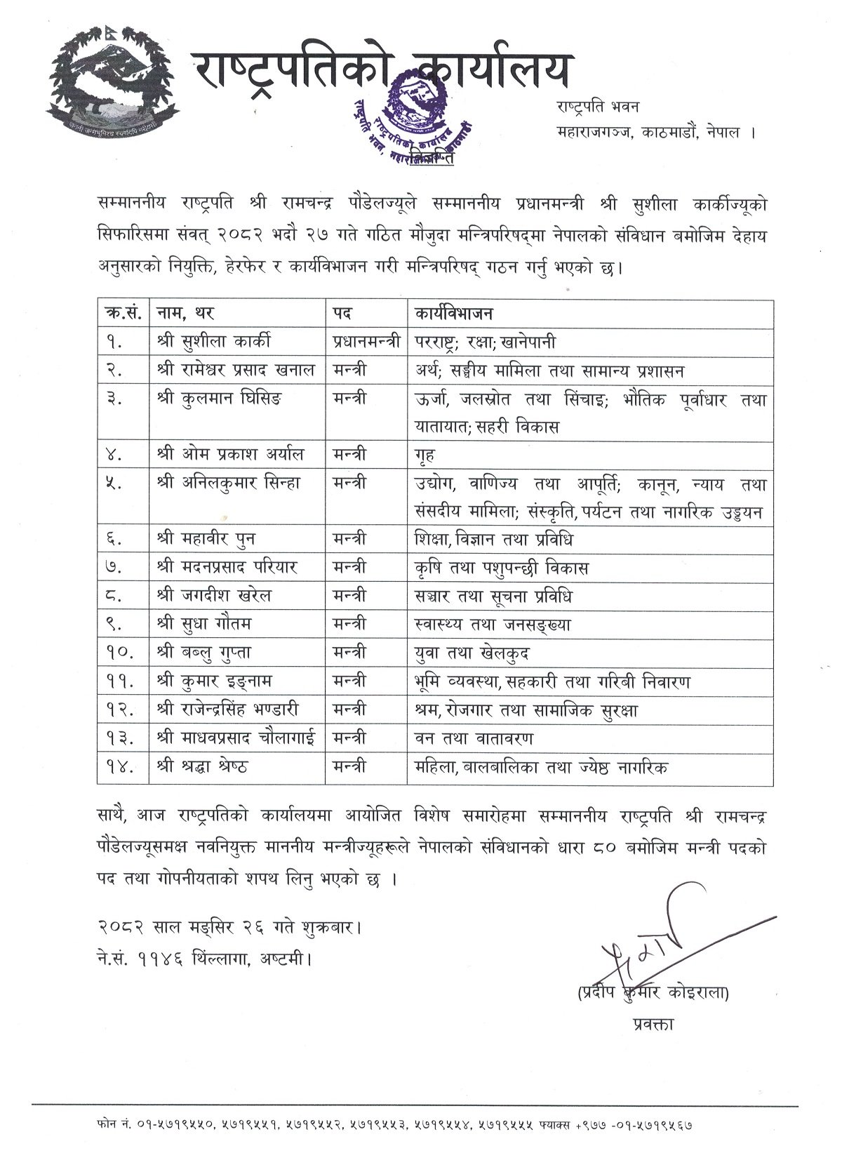 राष्ट्रपति कार्यालयमा चार जना नयाँ मन्त्रि नियुक्त भएपछि कार्की नेतृत्वको १४ सदस्यीय मन्त्रिमण्डल बनेको छ ।