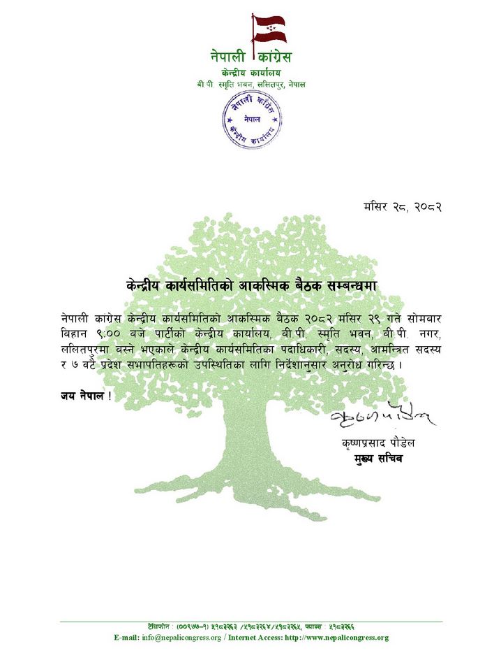 नेपाली कांग्रेसले केन्द्रीय कार्यसमितिको आकस्मिक बैठक बोलाएको छ ।