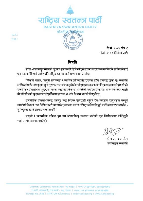 उपसभापति डोलप्रसाद अर्यालले विज्ञप्ति जारी गर्दै लामिछाने पार्टीको मूल जिम्मेवारीमा फर्किने जानकारी गराएका हुन् ।