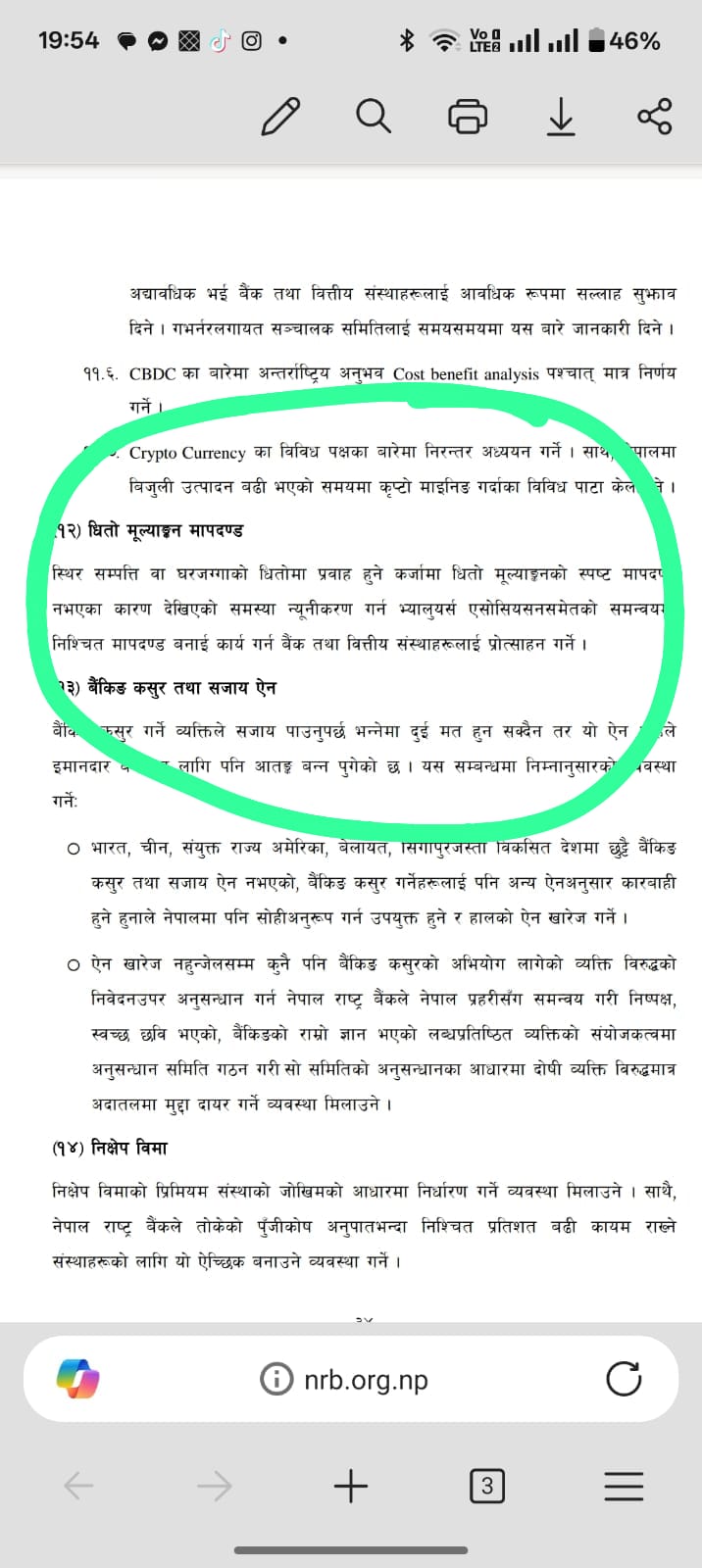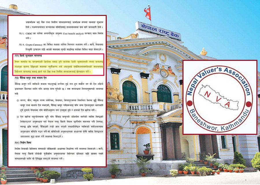 राष्ट्र बैंकले ‘बैंकिङ क्षेत्र सुधार सुझाव कार्यदल, २०८२ को प्रतिवेदन’ नाम दिएको उक्त निर्देशिकामा ‘धितो मुल्यांकन मापदण्ड’ शीर्षकभित्र स्थिर सम्पत्ति वा घरजग्गाको धितोमा प्रवाह हुने कर्जामा धितो मुल्यांकनको स्पष्ट मापदण्ड नभएका कारण देखिएको समस्या न्युनीकरण गर्न भ्यालुयर्स एशोसिएसनसमेतको समन्वयमा निश्चित मापदण्ड बनाई कार्य गर्न बैंक तथा वित्तिय संस्थाहरुलाई प्रोत्साहन गर्ने उल्लेख छ ।