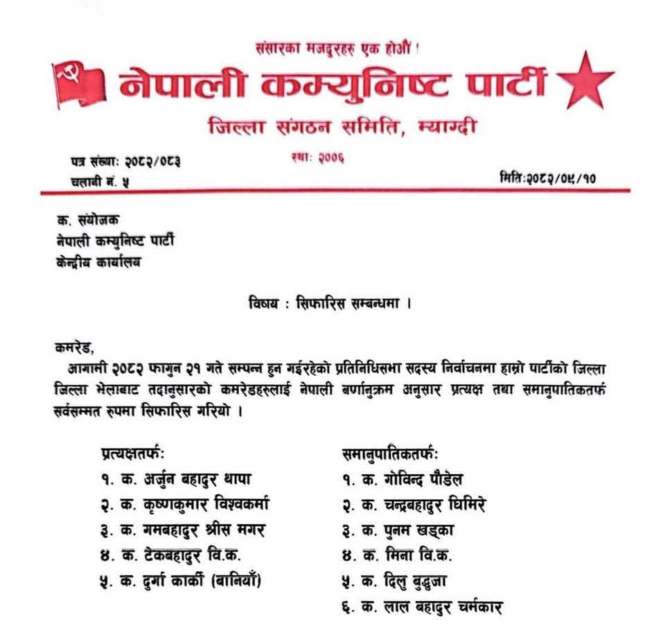 काठमाडौं । नेपाली कम्युनिष्ट पार्टीले आगामी प्रतिनिधि सभा निर्वाननका लागि म्याग्दी जिल्लाको प्रत्यक्षतर्फ अर्जुन बहादुर थापालाई उम्मेदवार सिफारिस गरेको छ ।