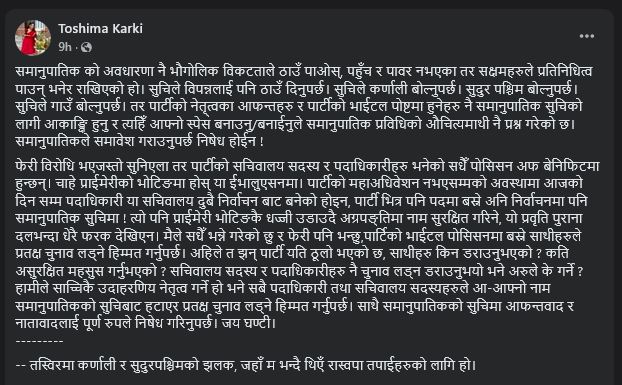 समानुपातिक को अवधारणा नै भौगोलिक विकटताले ठाउँ पाओस्, पहुँच र पावर नभएका तर सक्षमहरुले प्रतिनिधित्व पाउन् भनेर राखिएको हो। सुचिले विपन्नलाई पनि ठाउँ दिनुपर्छ। सुचिले कर्णाली बोल्नुपर्छ। सुदुर पश्चिम बोल्नुपर्छ। सुचिले गाउँ बोल्नुपर्छ। तर पार्टीको नेतृ्त्वका आफन्तहरु र पार्टीको भाईटल पोष्टमा हुनेहरु नै समानुपातिक सुचिको लागी आकाङ्क्षि हुनु र त्यहिँ आफ्नो स्पेस बनाउनुरबनाईनुले समानुपातिक प्रविधिको औचित्यमाथी नै प्रश्न गरेको छ। समानुपातिकले समावेश गराउनुपर्छ निषेध होईन १