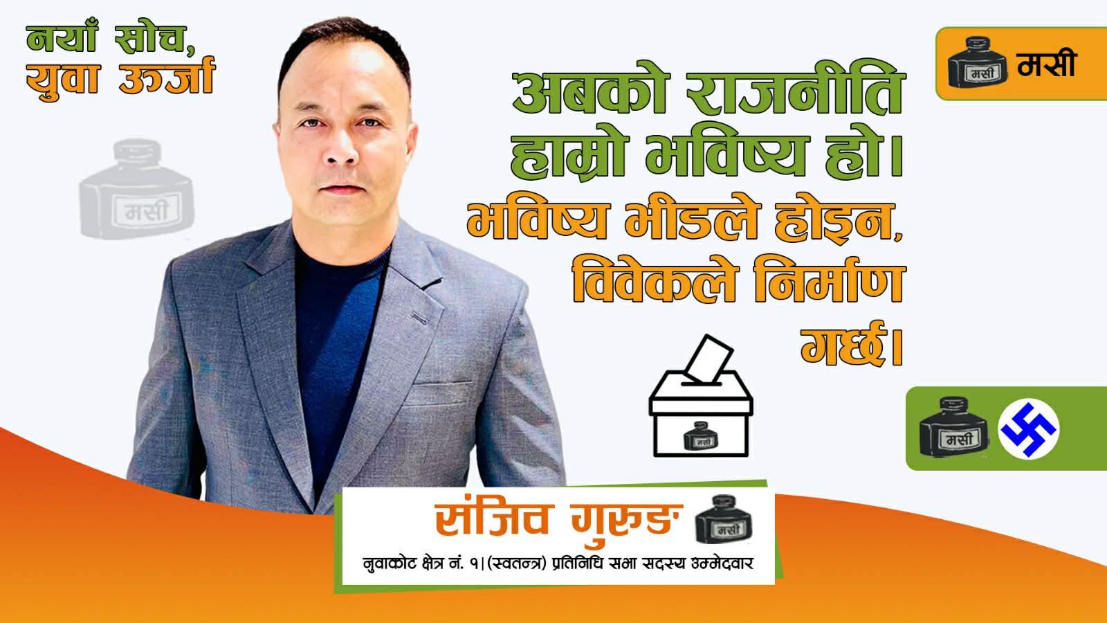 काठमाडौं,९ माघ । आगामी प्रतिनिधि सभा निर्वाचनका लागि नुवाकोट क्षेत्र नं १ का स्वतन्त्र उम्मेदवार संजिव गुरुङ्गले चुनावी घोषणापत्र सार्वजनिक गरेका छन् ।
