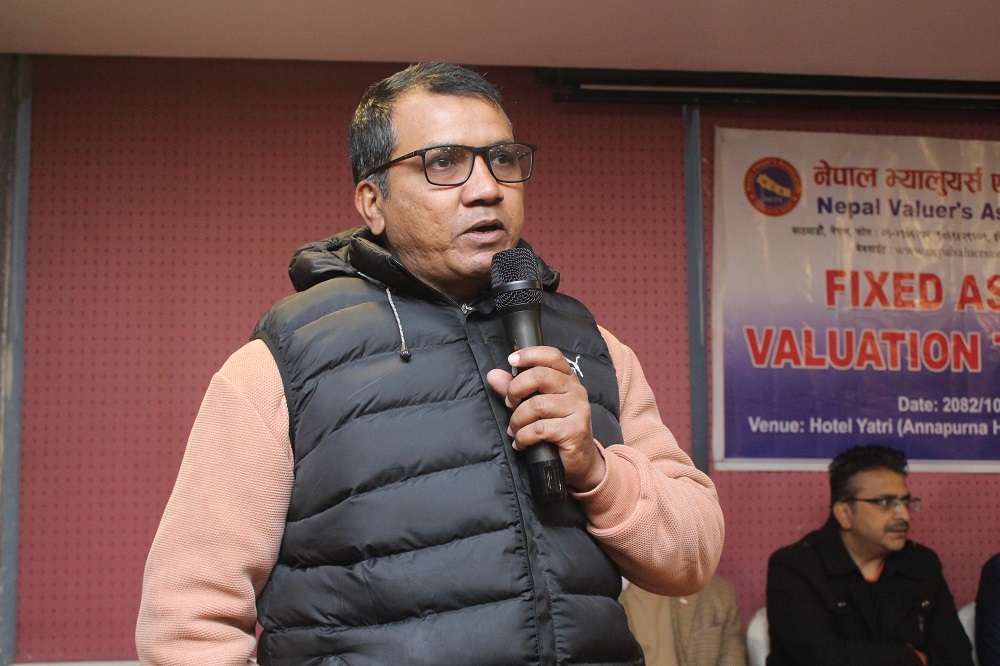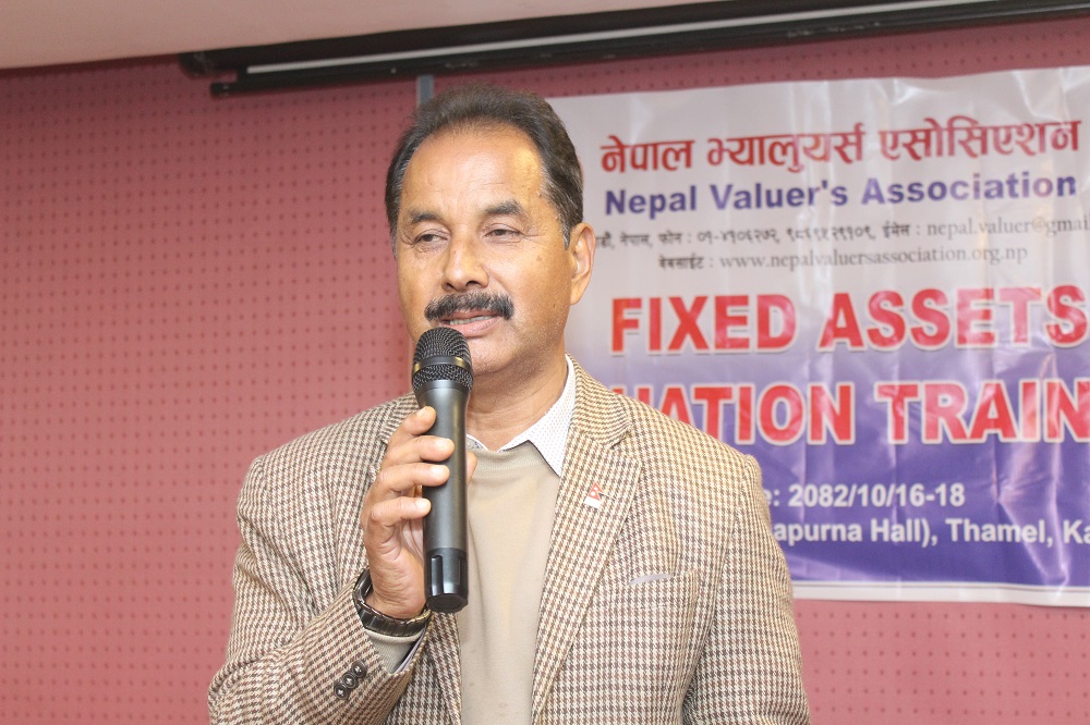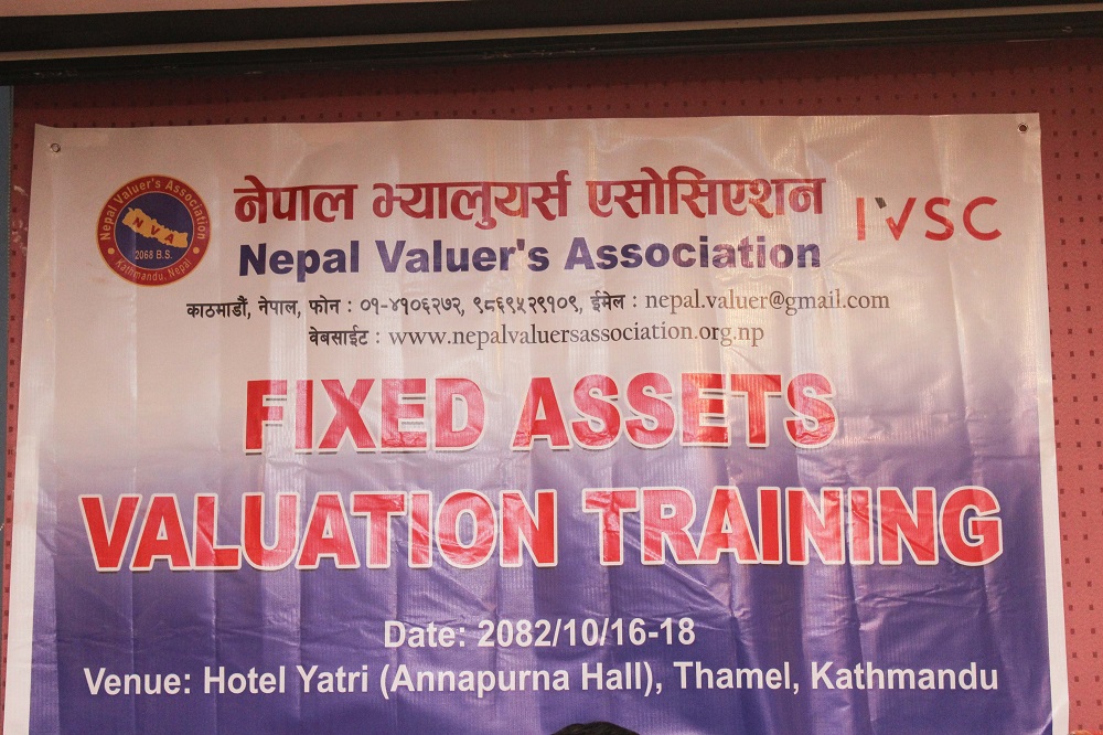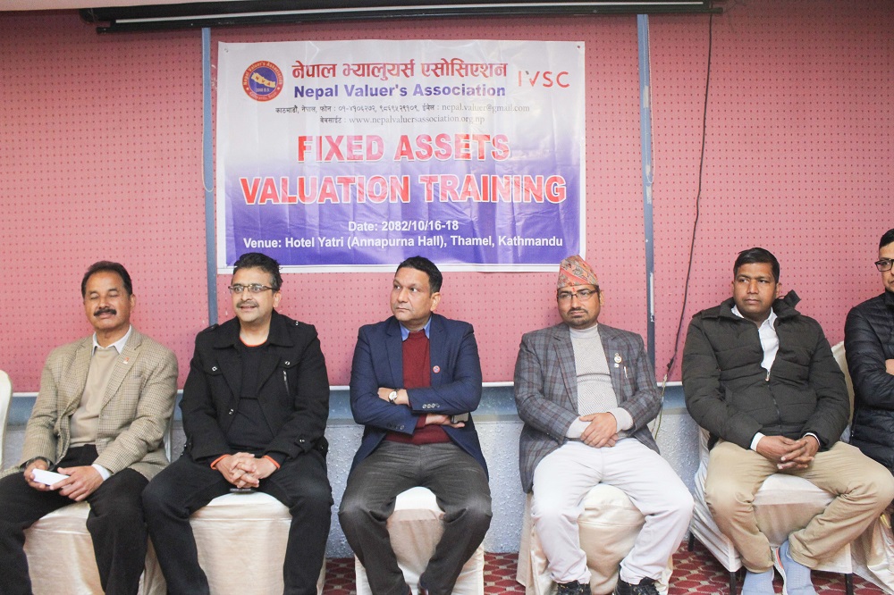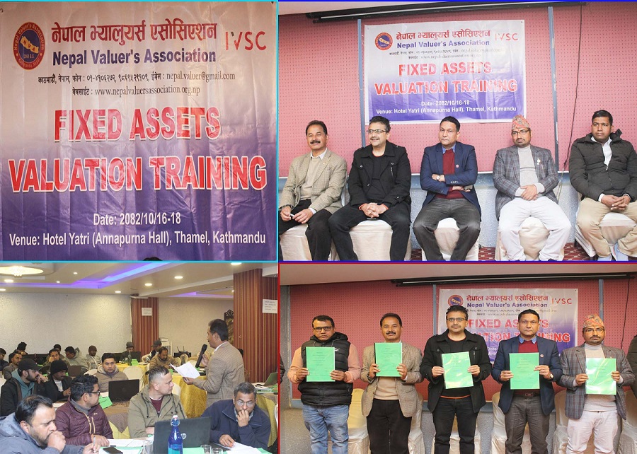 काठमाडौं, १६ माघ । सम्पत्ति मुल्यांकनकर्ता व्यवसायिक इन्जिनियरहरुको छाता संगठन नेपाल भ्यालुयर्स एशोसिएशन (एनभिए) को “अन्तर्राष्ट्रिय मूल्याङ्कन मापदण्ड र राष्ट्रिय अभ्यासहरू” सम्बन्धी ३ दिने तालिम आजदेखि सुरु भएको छ ।