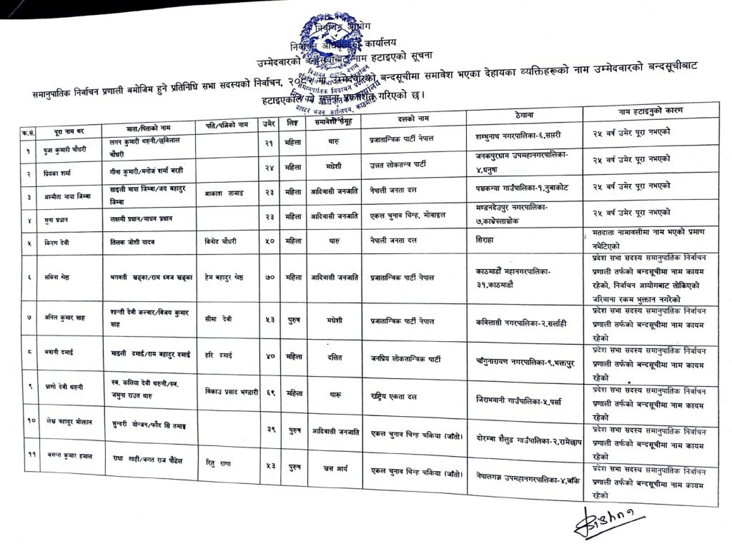 निर्वाचन सम्बन्धी कानुनले तोकको मापदण्डभित्र नपरेका विभिन्न दलबाट पेश भएका नामलाई आयोगले हटाएको हो।