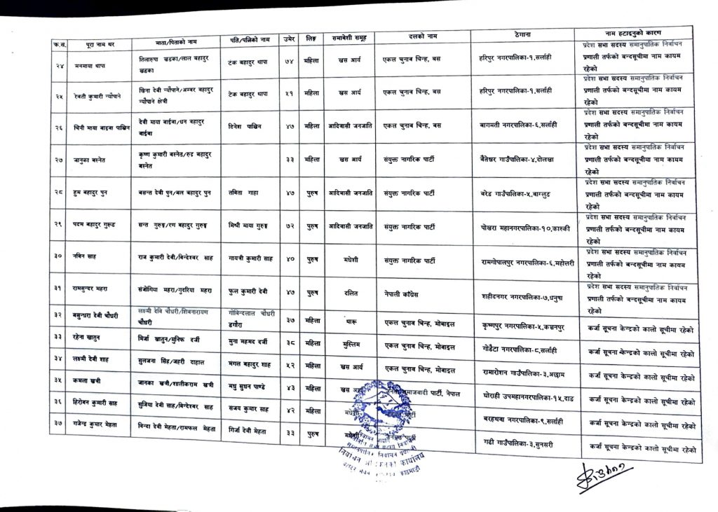 आयोगका प्रवक्ता नारायणप्रसाद भट्टराईका अनुसार कर्जा सूचना केन्द्रको कालो सूचीमा परेका २१ जना, प्रदेश सभा सदस्य समानुपातिक निर्वाचन प्रणालीतर्फको बन्दसूचीमा नाम कायम रहेका २५ जना र निर्वाचन आयोगवाट तोकिएको जरिवाना भुक्तान नगरेका १० जना छन्।