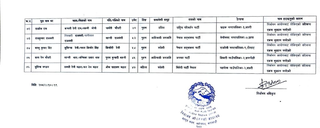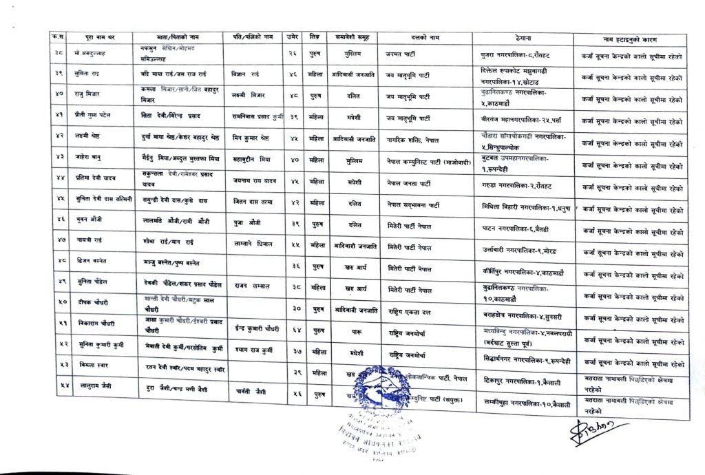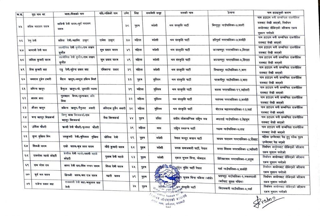 निर्वाचन सम्बन्धी कानुनले तोकको मापदण्डभित्र नपरेका विभिन्न दलबाट पेश भएका नामलाई आयोगले हटाएको हो।