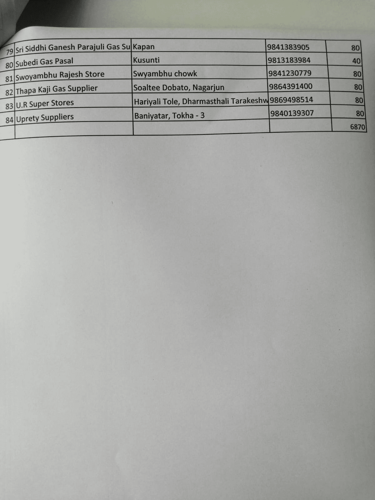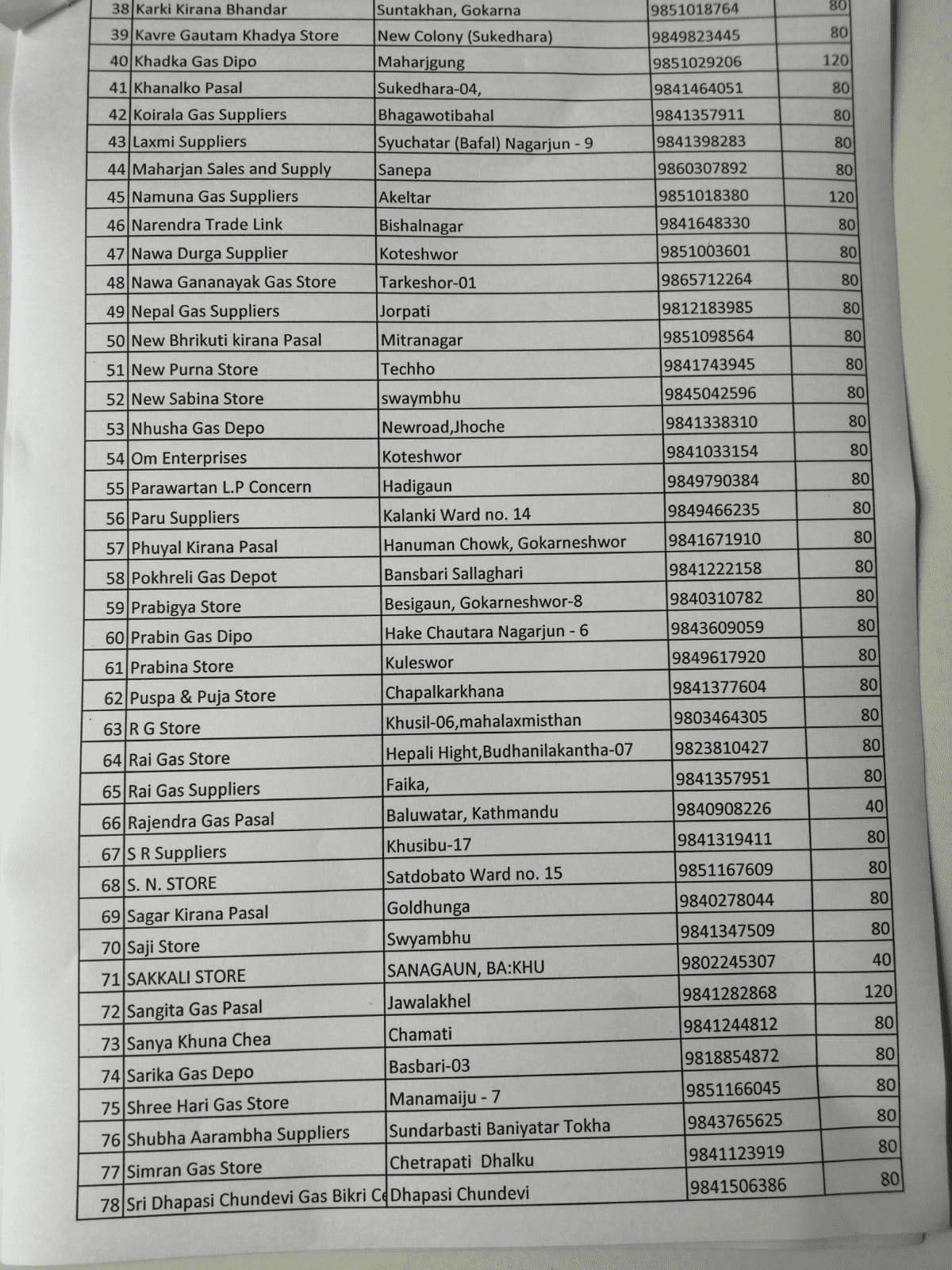 काठमाडौँ, २१ बुधबार । नेपाल आयल निगमले काठमाडौँ उपत्यकामा आज ८४ स्थानबाट बिक्री वितरण हुने नेपाल ग्यासको विवरण सार्वजनिक गरेको छ ।
