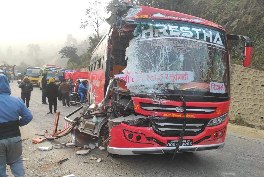 दाङबाट काठमाडौं आइरहेको प्रदेश नम्बर ३–०१–००६ ख १५५२ नम्बरको बस र काठमाडौंबाट रसुवागढीतर्फ जाँदै गरेको बागमती प्रदेश ०१–००६–ख १५५२ नम्बरको बस र काठमाडौंबाट रसुवातर्फ जाँदै गरेको बा।प्र।०१–००६ ख ५२०६ नम्बरको रिजर्भ बस आज बिहान करिब साढे ७ बजे ठोक्किएका थिए ।