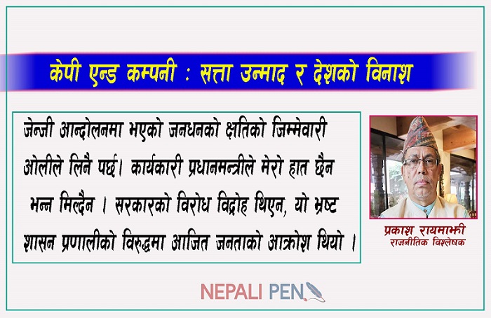 जेन्जी आन्दोलनमा भएको जनधनको क्षतिको जिम्मेवारी ओलीले लिनै पर्छ। कार्यकारी प्रधानमन्त्रीले ’मेरो हात छैन’ भन्न मिल्दैन । सरकारको विरोध विद्रोह थिएन, यो भ्रष्ट शासन प्रणालीको विरुद्धमा आजित जनताको आक्रोश थियो । महाकाली सन्धि, एमसीसी पास गर्ने, नागरिकता ऐन बनाउने, कोशी–चुरे क्षेत्र उत्खनन् गरेर ढुंगाको तस्करी गर्न गर्न बजेटमा राख्ने, यी सबै ओलीको निर्देशन अन्तर्गत भएका काम हुन् । यस आपराधिक काममा ओलीका बफादार सुकुम्बासीबाट अर्वोपति भएकाविष्णु पौडेल लगायतका व्यक्ति अझै पनि नैतिकताको पाठ पढाएर हिँडिरहेका छन् । ओलीले राष्ट्रवादको खोक्रो ढाँचा प्रयोग गरेर जनतालाई उल्लु बनाउँदै राज्य सत्ता कब्जा गरे। उनी न त राष्ट्रवादी हुन् न त देशभक्त; उनी त केवल राजनीतिक माफिया हुन्, जसले राजनीतिलाई पेसा बनाउँदै देश लुट्ने धन्दा चलाइरहेका छन् ।
