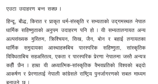 नेपाली कांग्रेसले आफ्नो प्रतिज्ञापत्रमार्फत नेपालको आध्यात्मिक–सांस्कृतिक सम्पदालाई अन्तर्राष्ट्रिय स्तरमा प्रवर्द्धन गर्दै राष्ट्रिय गौरव, पर्यटन, सामाजिक सद्भाव र सांस्कृतिक नेतृत्व सुदृढ गर्ने लक्ष्य अघि सारेको जनाएको छ।