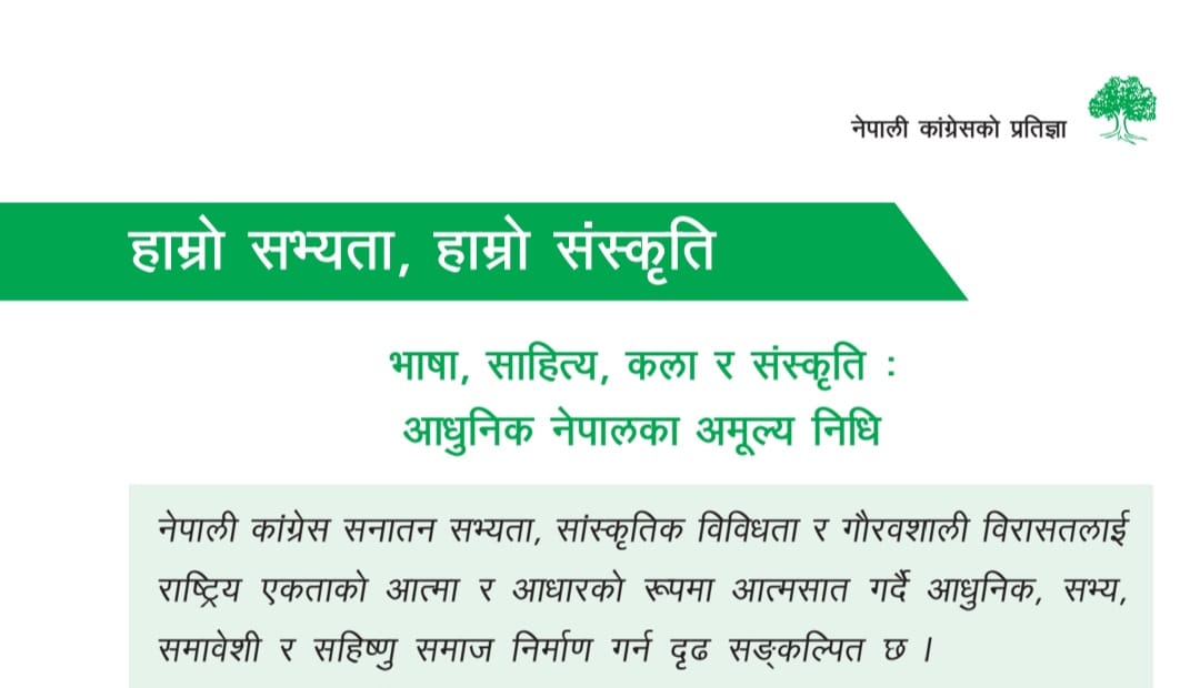 नेपाली कांग्रेसले आफ्नो प्रतिज्ञापत्रमार्फत नेपालको आध्यात्मिक–सांस्कृतिक सम्पदालाई अन्तर्राष्ट्रिय स्तरमा प्रवर्द्धन गर्दै राष्ट्रिय गौरव, पर्यटन, सामाजिक सद्भाव र सांस्कृतिक नेतृत्व सुदृढ गर्ने लक्ष्य अघि सारेको जनाएको छ।
