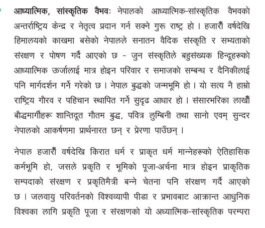पार्टीले नेपाललाई विश्व शान्ति र आध्यात्मिक चेतनाको प्रतीकका रूपमा स्थापित गर्न सकिने “गुरू राष्ट्र”को रूपमा व्याख्या गर्दै बुद्ध जन्मभूमिको गौरवलाई राष्ट्रिय पहिचानसँग जोडेको छ।