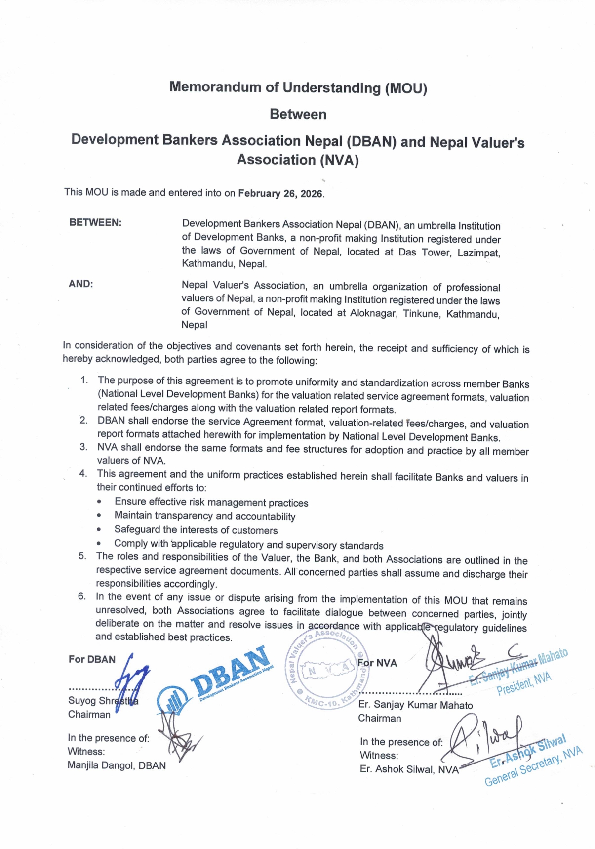 सम्झौतापत्रमा डिबानका अध्यक्ष सुयोग श्रेष्ठ र एनभिएका अध्यक्ष इन्जिनियर संजय महतोले हस्ताक्षर गरेका हुन्। एनभिएका सचिव इन्जिनियर रबिन्द्र अधिकारीका अनुसार सम्झौतामा प्रत्येक ४ वर्षमा सेवा शुल्क पुनरावलोकन गर्ने व्यवस्था पनि स्पष्ट रूपमा उल्लेख गरिएको छ।