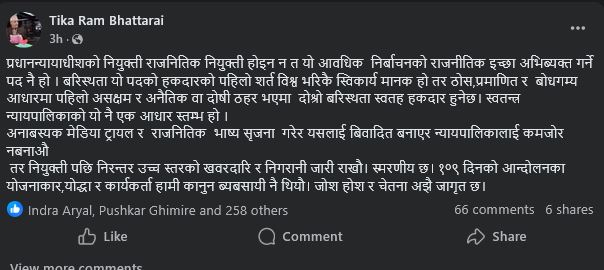 काठमाडौं, ८ चैत्र । वरिष्ठ अधिवक्ता टिकाराम भट्टराईले प्रधानन्यायाधीशको नियुक्ति कुनै राजनीतिक भागबण्डा वा आवधिक निर्वाचनको इच्छा अभिव्यक्ति गर्ने पद नभएको स्पष्ट पारेका छन्।