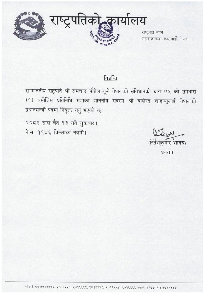 राष्ट्रपति रामचन्द्र पौडेलले आज शाहलाई प्रधानमन्त्री नियुक्त गरेको राष्ट्रपति कार्यालय स्रोतले सेतोपाटीलाई जानकारी दिएको छ।