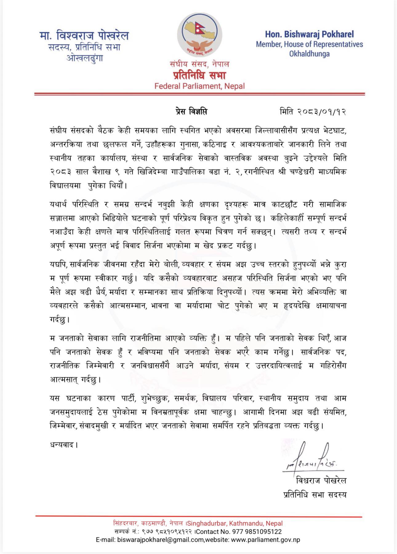 ‘सार्वजनिक जीवनमा रहँदा मेरो बोली, व्यवहार र संयम अझ उच्च स्तरको हुनुपर्थ्यो भन्ने कुरा म पूर्ण रूपमा स्वीकार गर्छु । यदि कसैको व्यवहारबाट असहज परिस्थिति सिर्जना भएको भए मैले अझ बढी धैर्य, मर्यादा र सम्मानका साथ प्रतिक्रिया दिनुपर्थ्यो। त्यस क्रममा मेरो अभिव्यक्ति वा व्यवहारले बसैको आत्मसम्मान, भावना वा मर्यादामा चोट पुगेको भए म हृदयदेखि क्षमायाचा गदर्छु।’-उनले भनेका छन् । यथार्थ परिस्थिति र समग्र सन्दर्भ नबुझी केही क्षणका दृश्यहरू मात्रै काँटछाँट गरी सामाजिक सञ्जालमा भिडिओ भाइरल बनाइएको उनको दाबी छ।