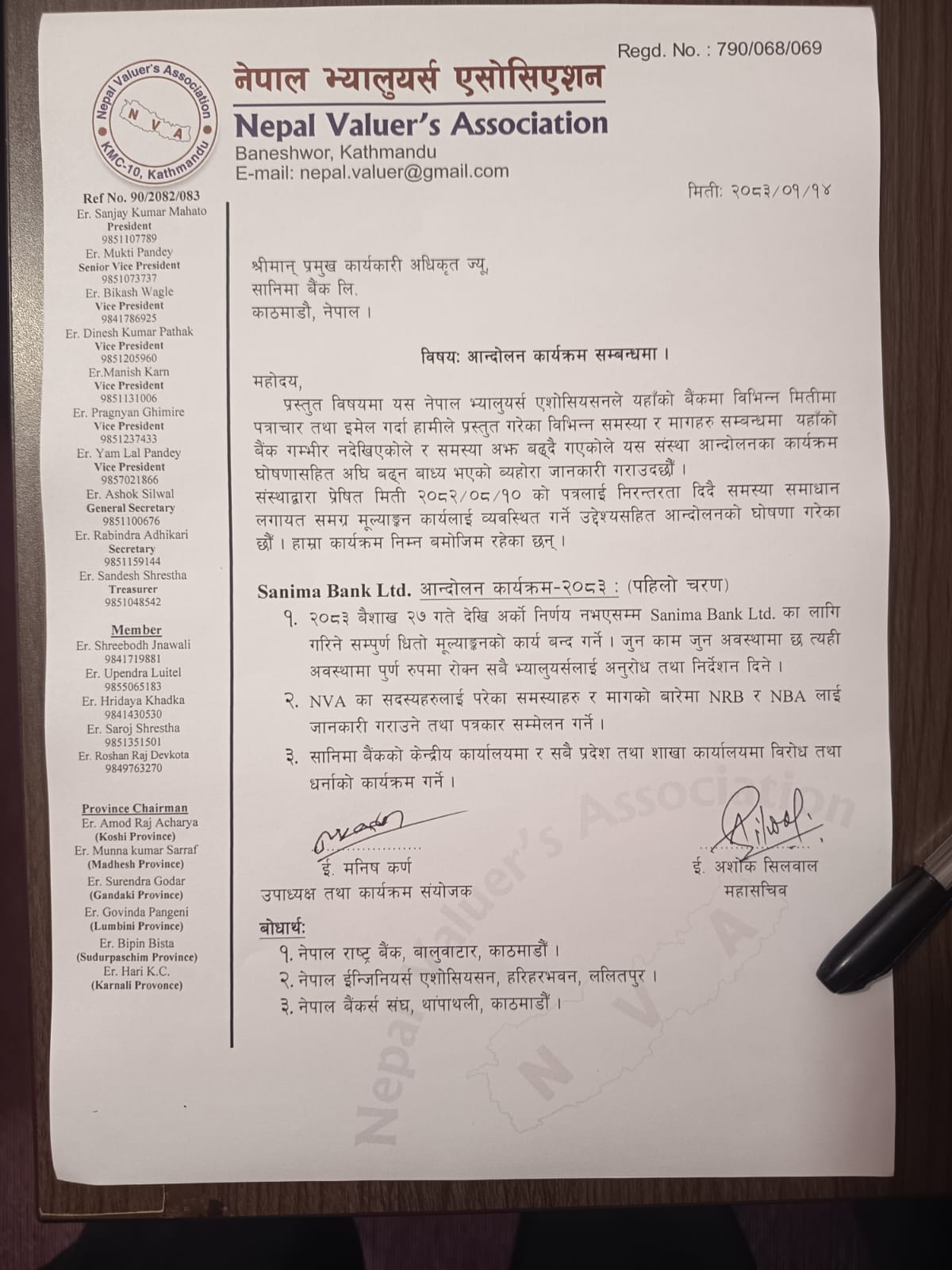 एनभिएको चेतावनीले बैंकिङ क्षेत्रमा नयाँ बहस सुरु गरेको छ। यदि आन्दोलन थप चर्कियो भने बैंकको धितो मूल्यांकन प्रक्रिया ठप्प हुने, ऋण प्रवाह प्रभावित हुने र वित्तीय कारोबारमै असर पर्ने सम्भावना रहेको बैंकिङ क्षेत्रका जानकारहरु बताउँछन्।