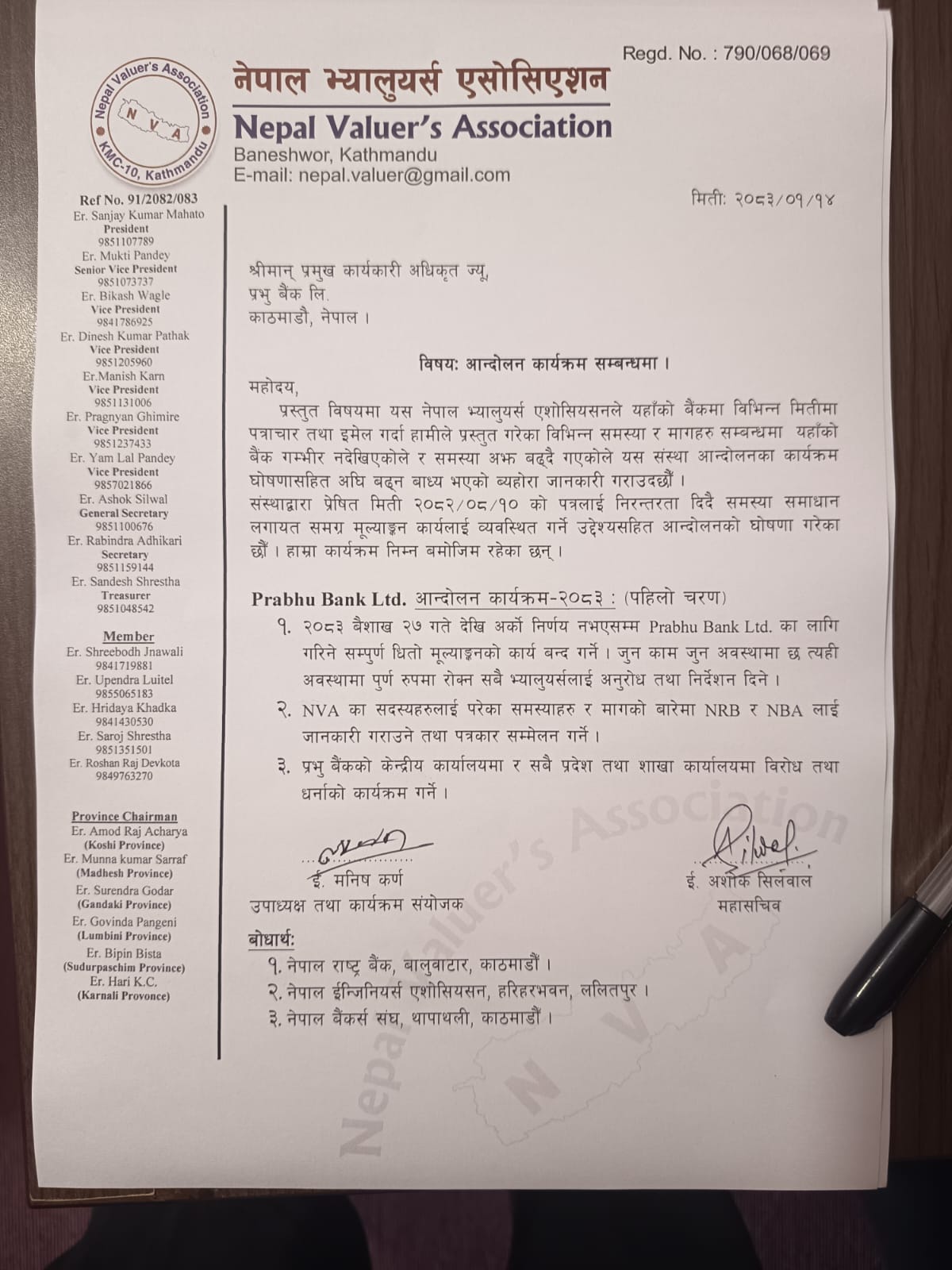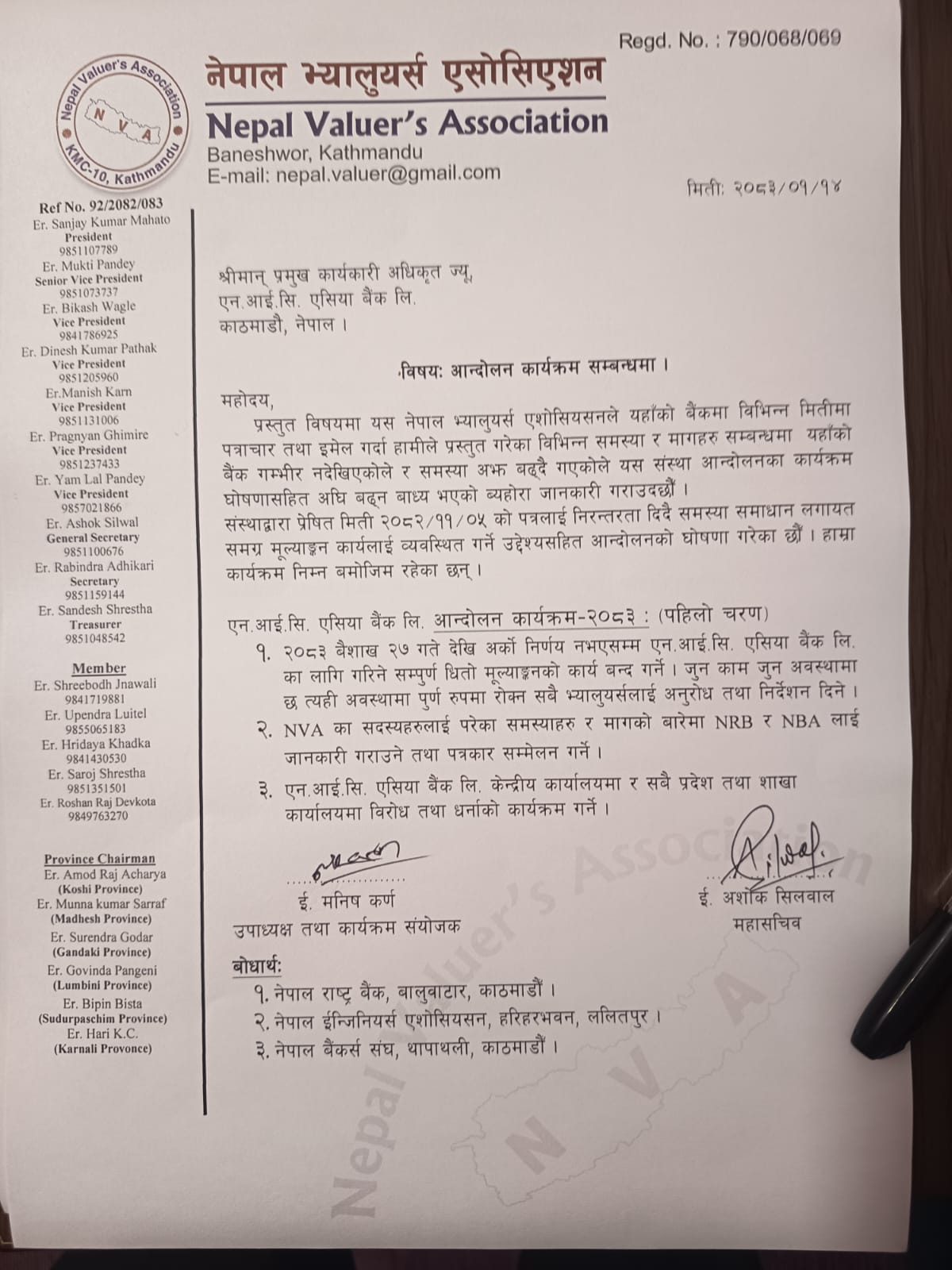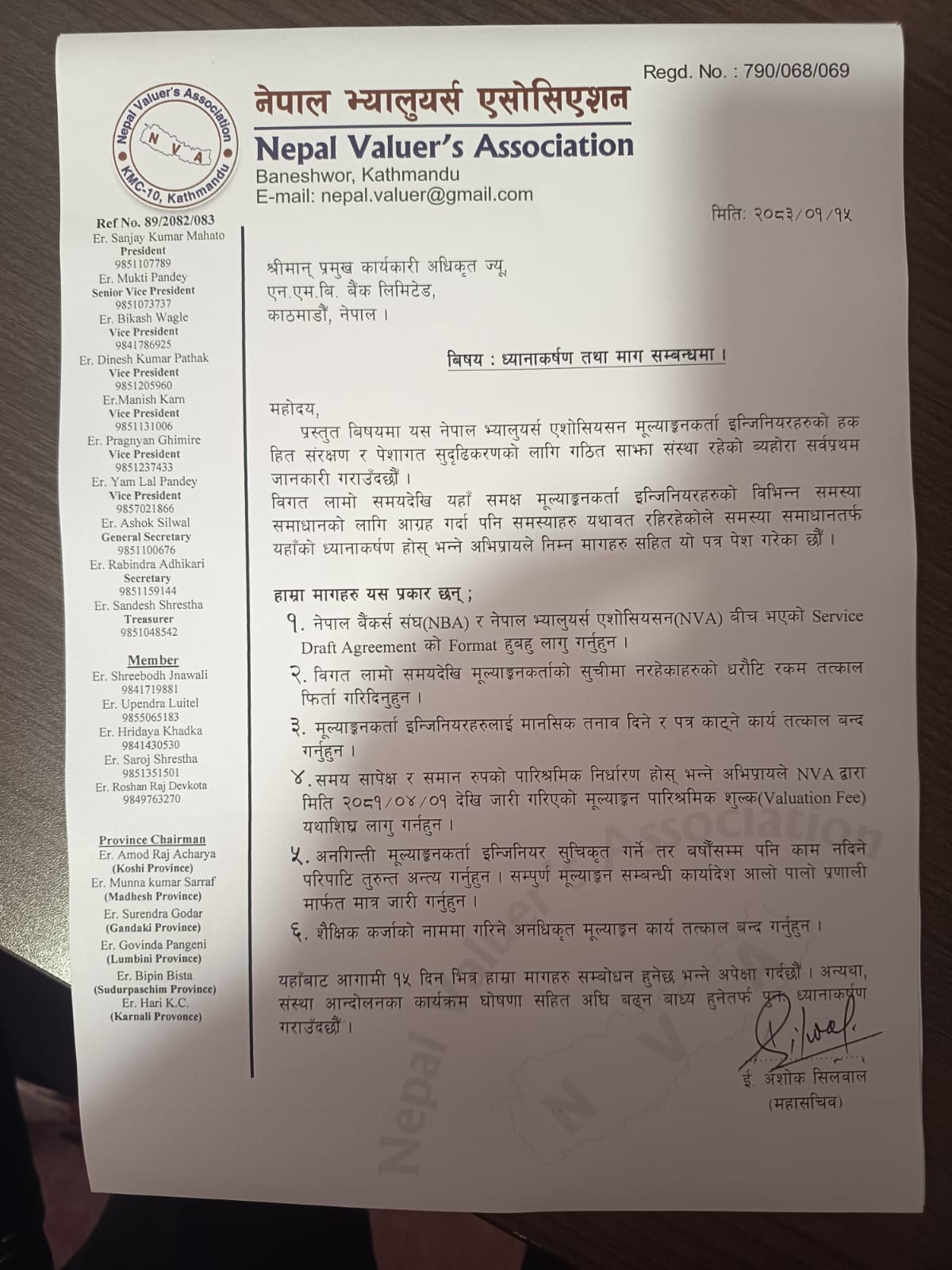 यसअघि एनभिएले नेपाल एसबिआई बैंक र प्राइम कमर्सियल बैंकविरुद्ध मूल्यांकनकर्ता इन्जिनियरहरुको माग बेवास्ता गरिए देशभर सम्पत्ति मूल्यांकनसँग सम्बन्धित सम्पूर्ण काम ठप्प पार्ने चेतावनीसहित औपचारिक पत्राचार गरेको थियो। संस्थाले आफ्ना सदस्यहरुको पेशागत सम्मान, सेवा सुरक्षा र पारिश्रमिक सुनिश्चितताका लागि दबाबमूलक कार्यक्रमको तयारी गरेको जनाएको थियो।
