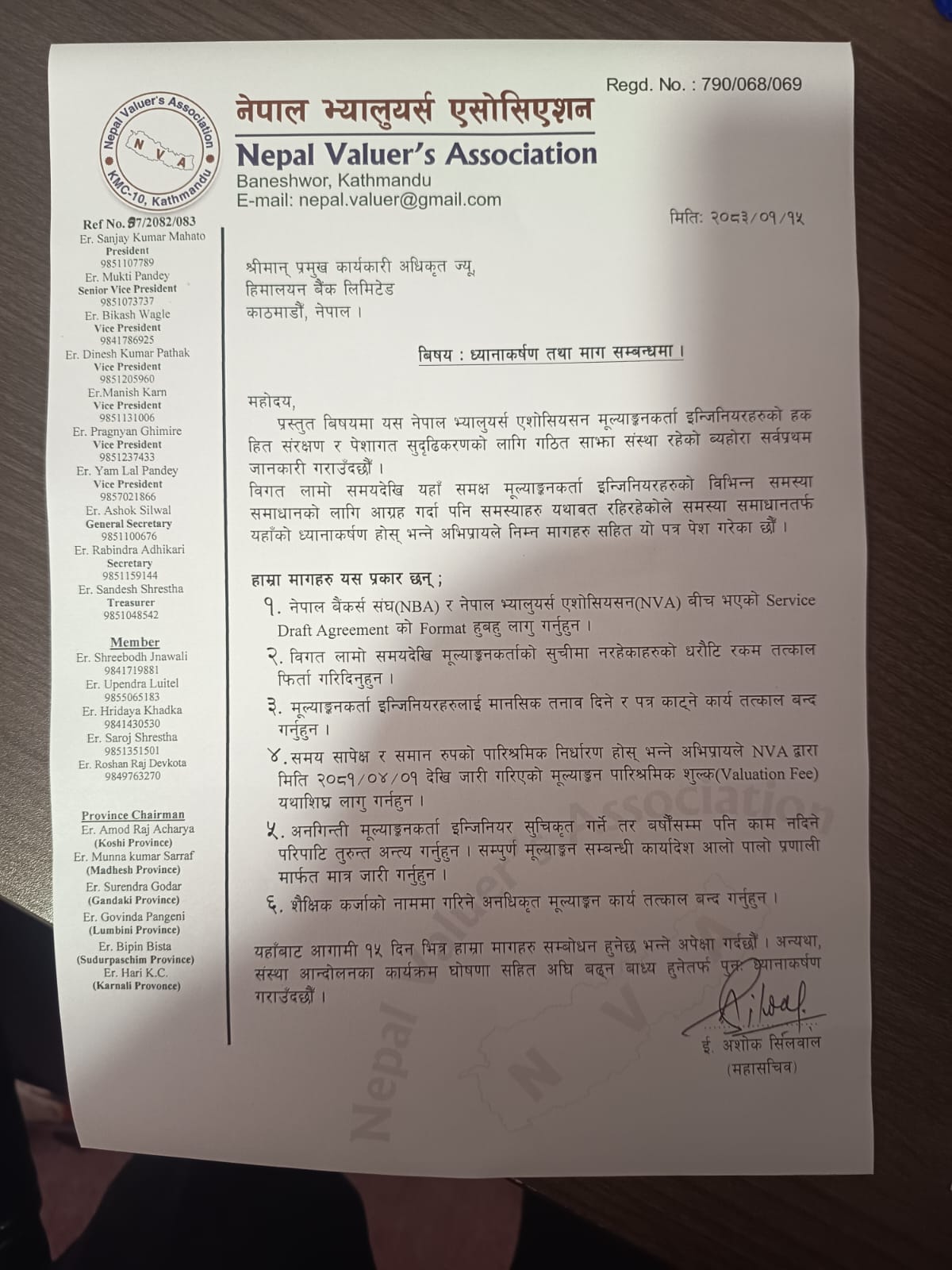 वैशाख २७ गतेभित्र माग पुरा नभए २८ गतेदेखि यी तीन बैंकसँग सम्बन्धित सम्पूर्ण भ्यालुएसन (सम्पत्ति मूल्यांकन) का काम बन्द गरिने चेतावनी दिइएको छ । यसले बैंकिङ क्षेत्रको कर्जा प्रवाह, धितो मूल्यांकन र ऋण स्वीकृति प्रक्रियामा प्रत्यक्ष असर पार्न सक्ने देखिएको छ।