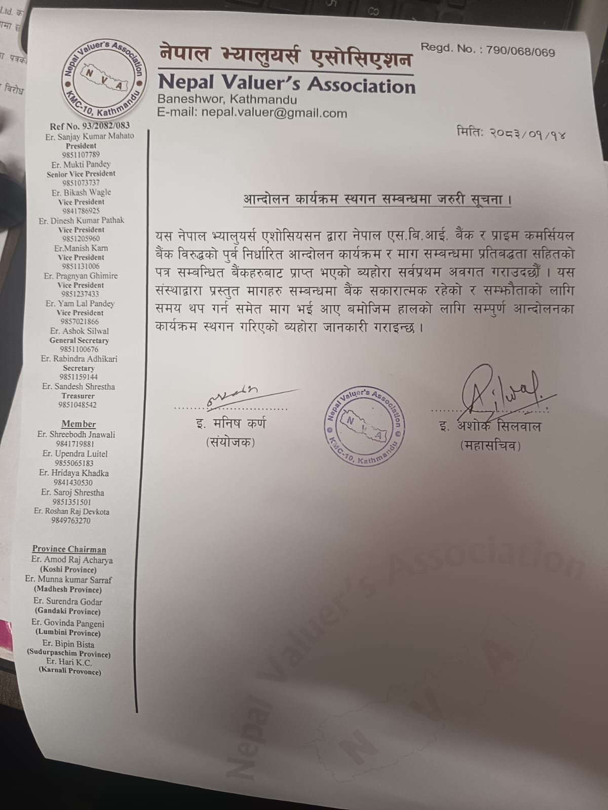 काठमाडौं । सम्पत्ति मूल्यांकनकर्ता इन्जिनियरहरुको हकहितका लागि संघर्षरत नेपाल भ्यालुयर्स एशोसिएशन (एनभिए)ले प्राइम र नेपाल एसबिआइ बैंकबीच लिखित प्रतिबद्धतापछि तत्कालको लागि दुवै बैंकविरुद्ध आन्दोलन स्थगित गरेको छ ।