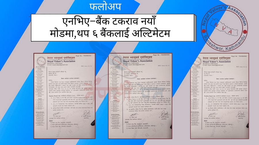 संस्थाले आफ्ना सदस्यहरुलाई परेको समस्या र बैंकहरुसँग भइरहेको व्यवहारबारे नेपाल राष्ट्र बैंक र नेपाल बैंकर्स संघलाई समेत औपचारिक जानकारी गराउने जनाएको छ। एनभिएको दाबी छ—सम्पत्ति मूल्यांकनजस्तो संवेदनशील र जिम्मेवार काममा संलग्न प्राविधिक जनशक्तिको मागलाई बैंकहरुले बेवास्ता गर्दा समस्या चर्किएको हो।